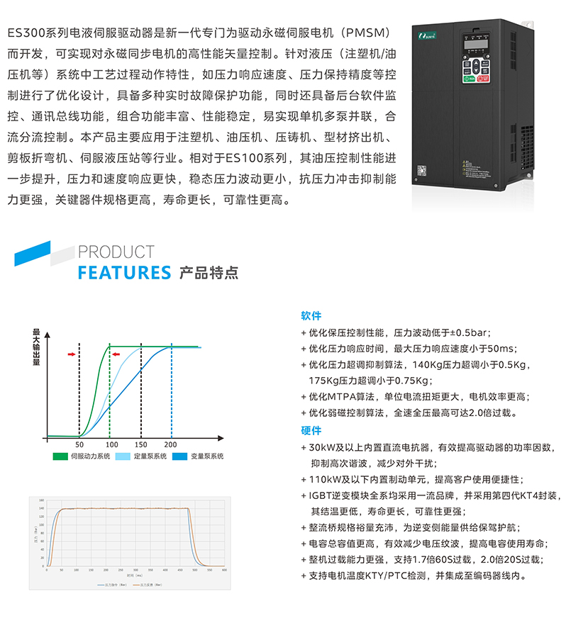 ES300系列電液驅(qū)動器是新一代專門為驅(qū)動永磁電機(jī)(PMSM)而開發(fā),可實(shí)現(xiàn)對永磁同步電機(jī)的高性能矢量控制。針對液壓(注塑機(jī)/油壓機(jī)等)系統(tǒng)中工藝過程動作特性,如壓力響應(yīng)速度、壓力保持精度等控制進(jìn)行了優(yōu)化設(shè)計(jì),具備多種實(shí)時(shí)故障保護(hù)功能,同時(shí)還具備后臺軟件監(jiān)控、通訊總線功能,組合功能豐富、性能穩(wěn)定,易實(shí)現(xiàn)單機(jī)多泵并聯(lián),合流分流控制。本產(chǎn)品主要應(yīng)用于注塑機(jī)、油壓機(jī)、壓鑄機(jī)、型材擠出機(jī)、剪板折彎機(jī)、伺服液壓站等行業(yè)。相對于ES100系列,其油壓控制性能進(jìn)一步提升,壓力和速度響應(yīng)更快,穩(wěn)態(tài)壓力波動更小,抗壓力沖擊抑制能力更強(qiáng),關(guān)鍵器件規(guī)格更高,壽命更長,可靠性更高。