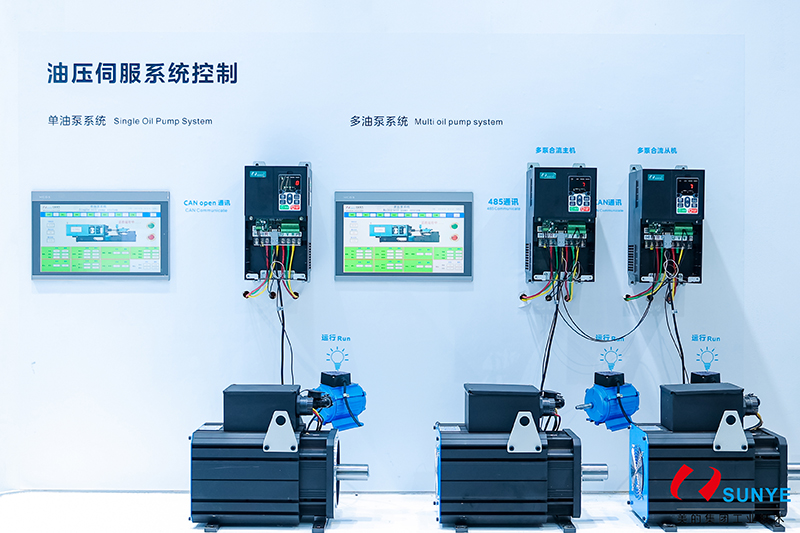 本次展會結(jié)合電液伺服的應(yīng)用工況,動態(tài)展示了兩套系統(tǒng),單機系統(tǒng)及并機系統(tǒng)。單機系統(tǒng)主要是為了向客戶展示我們的Canopen通訊應(yīng)用功能,由觸摸屏、PLC、驅(qū)動器和電機組成,PLC和驅(qū)動器之間通過Canopen通訊進行數(shù)據(jù)交互。并機系統(tǒng)主要是為了向客戶展示我們的多泵合流功能,由觸摸屏、PLC、兩臺驅(qū)動器和兩臺電機組成,選擇其中一臺驅(qū)動器為主機,則另一臺驅(qū)動器為從機,主機與從機之間通過can通訊進行數(shù)據(jù)交互,從機跟隨主機轉(zhuǎn)速,模擬多泵合流應(yīng)用工況。電機工作時,為了進一步模擬注塑機的運行工況,以5秒為單位,100秒為運行周期,分為8個步驟,每個步驟展現(xiàn)不同的運行頻率,有快有慢,周而復(fù)始。