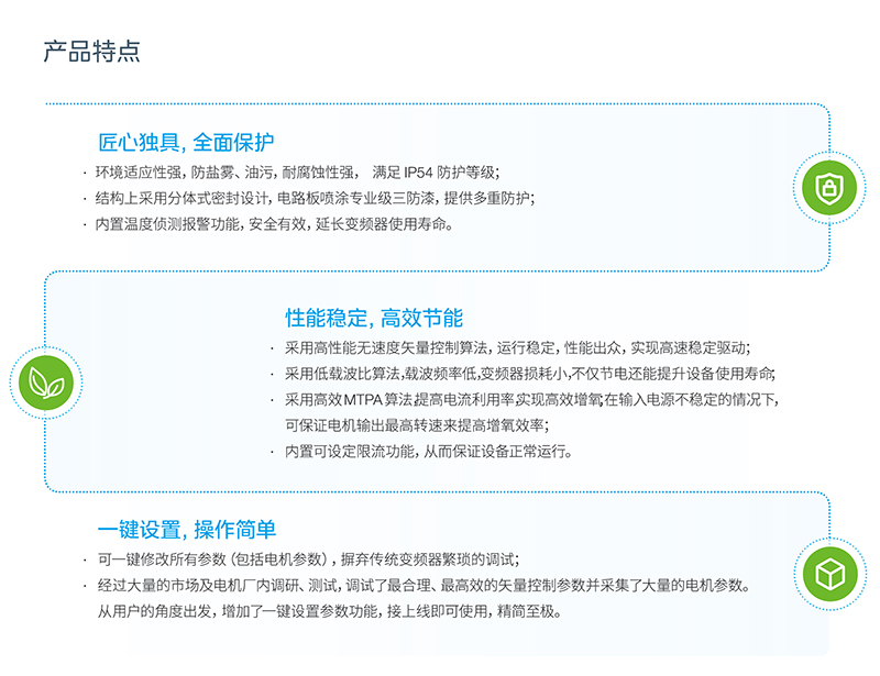 MH600 系列高防護(hù)變頻器是針對(duì)惡劣環(huán)境應(yīng)用,如鋼鐵、石油、化工、風(fēng)機(jī)、水泵、養(yǎng)殖等特殊領(lǐng)域開(kāi)發(fā)的專(zhuān)用變頻器。結(jié)構(gòu)上采用分體式密封設(shè)計(jì),電路板噴涂專(zhuān)業(yè)級(jí)三防漆,提供多重防護(hù)。整機(jī)抗氧化、抗鹽霧、抗霉菌、耐溫耐潮、耐腐蝕,防護(hù)等級(jí)可達(dá)IP54以上,適用于各種惡劣環(huán)境應(yīng)用。且內(nèi)置溫度偵測(cè)報(bào)警功能,安全有效,有效提高變頻器使用壽命。