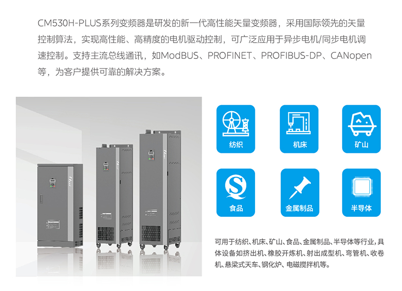 CM530H-PLUS系列變頻器是研發(fā)的新一代高性能矢量變頻器,采用國際領(lǐng)先的矢量控制算法,實(shí)現(xiàn)高性能、高精度的電機(jī)驅(qū)動控制,可廣泛應(yīng)用于異步電機(jī)/同步電機(jī)調(diào)速控制。支持主流總線通訊,如ModBUS、PROFINET、PROFIBUS-DP、CANopen等,為客戶提供可靠的解決方案。